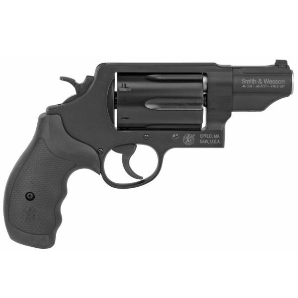 The light Smith and Wesson Governor Revolver is a very versatile weapon that combines precision and accuracy. This revolver comes chambered in .410 Gauge and .45 Colt, is finished in black, and can hold 6 rounds. It has a large Z-frame, finger grooved black polymer grips, and an exposed hammer.