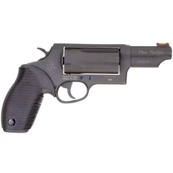 The Taurus Judge Magnum is capable of chambering both .410 gauge 2.5" or 3" shotshells and 45 Colt ammunition. This amazing combo is ideal for short distances where most altercations occur, or longer distances with the 45 Colt ammo. Taurus has finely tuned the rifling to spread the shot pattern at close quarters or to guide the .45 caliber bullet to the target. This model has a 3" barrel with a fiber optic front sight and fixed rear. It has a matte black metal finish and a black Ribber grip.