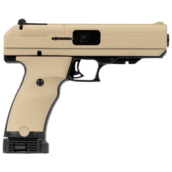 This Hi-Point 45 ACP pistol is constructed of a high-impact polymer with 3-dot fully-adjustable sights. Other features include a free trigger lock, a magazine disconnect safety, and a FDE American Flag finish.